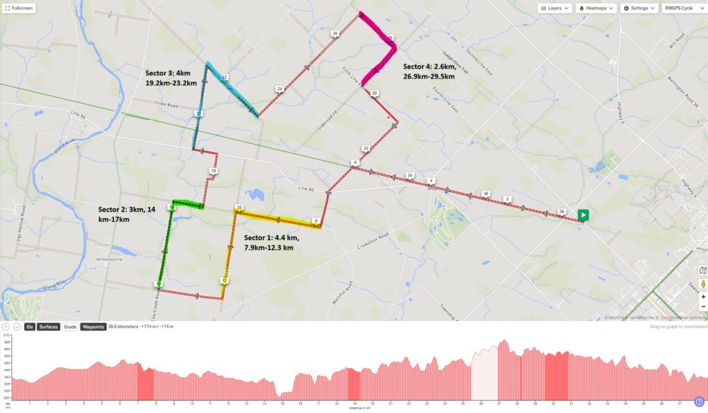 - SECTOR 3: 4 km total (19.2-23.2 km) Start NB on Wollis Road, End at Weisenberg x Side Road 12 corner.
